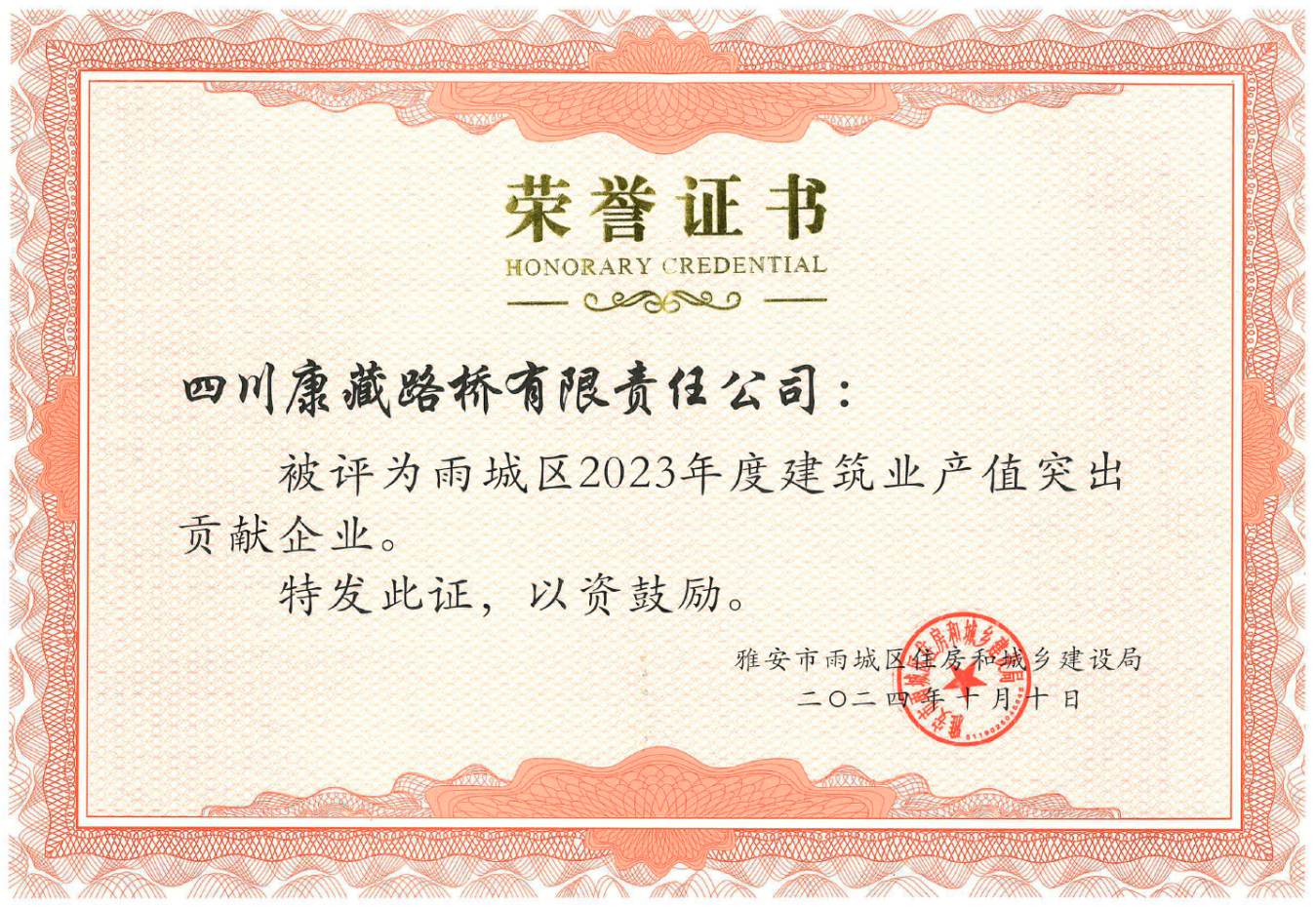 今年10月,路橋公司被雅安市雨城區(qū)住房和城鄉(xiāng)建設(shè)局評為“雨城區(qū)2023年度建筑業(yè)產(chǎn)值突出貢獻企業(yè)”。下一步,路橋公司將持續(xù)貫徹落實市委、市政府決策部署,把學(xué)習(xí)貫徹落實黨的二十大精神與生產(chǎn)經(jīng)營工作結(jié)合起來,發(fā)揮項目引領(lǐng)支撐作用,為地方經(jīng)濟的發(fā)展持續(xù)貢獻力量。
