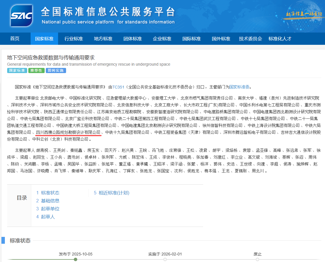 四川西康公路規(guī)劃勘察設(shè)計(jì)有限公司參與編制的國(guó)家標(biāo)準(zhǔn)《地下空間應(yīng)急救援?dāng)?shù)據(jù)與傳輸通用要求》正式發(fā)布