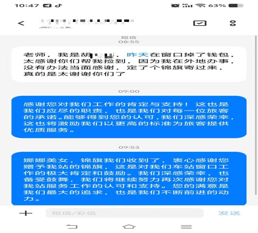 5月14日11時(shí)11分,售票員郝凌云發(fā)現(xiàn)柜臺上遺留了一個(gè)卡包,內(nèi)有現(xiàn)金 300 元、多張銀行卡、身份證及社?ǖ戎匾锲贰:铝柙频谝粫r(shí)間上報(bào)值班科長,通過站務(wù)系統(tǒng)比對購票信息,僅用5分鐘便鎖定失主為即將前往漢源的旅客胡女士,此時(shí)胡女士正在等待檢票,尚未察覺錢包丟失。值班站長通過廣播系統(tǒng)緊急尋人,胡女士聽到廣播后立即前往值班室認(rèn)領(lǐng)物品,經(jīng)值班科長仔細(xì)核對身份及物品信息后,將卡包完好歸還。胡女士激動致謝:“太感謝你了!你們汽車站的工作人員素質(zhì)真高,太讓人暖心了!”