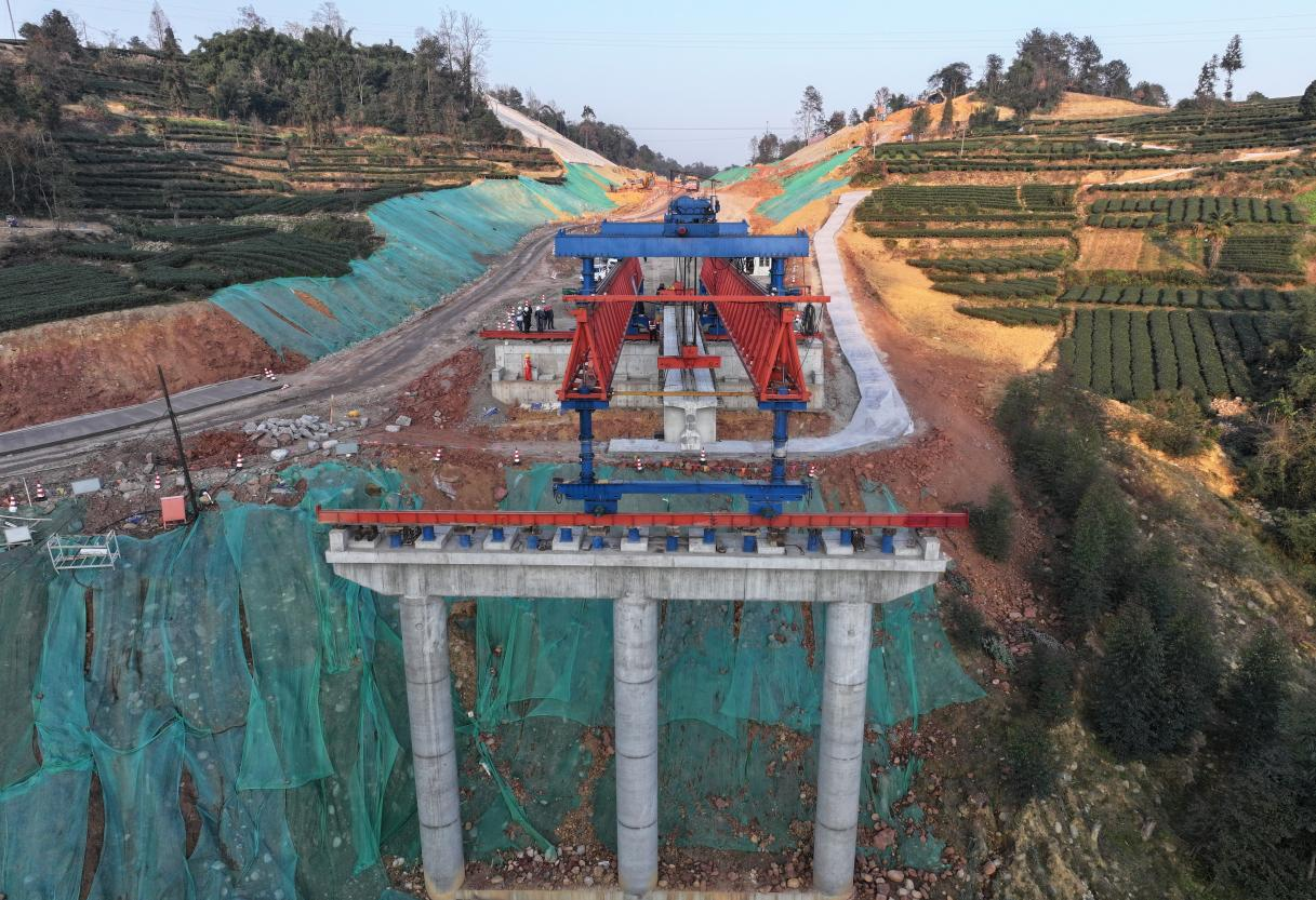 在橋梁建設(shè)方面,項目部面對橋位地形復(fù)雜、架設(shè)精度要求高、現(xiàn)場作業(yè)難度大等多重挑戰(zhàn),引入JQJ200-40A3型三角桁架雙導(dǎo)梁架橋機(jī)進(jìn)行梁體架設(shè)作業(yè),該設(shè)備全長65.34米,高7.8米,采用全電控操作系統(tǒng),具備機(jī)械化移梁、精準(zhǔn)落梁等功能,可攜邊梁直接從中梁位置一次橫移就位,實現(xiàn)了全斷面機(jī)械化、