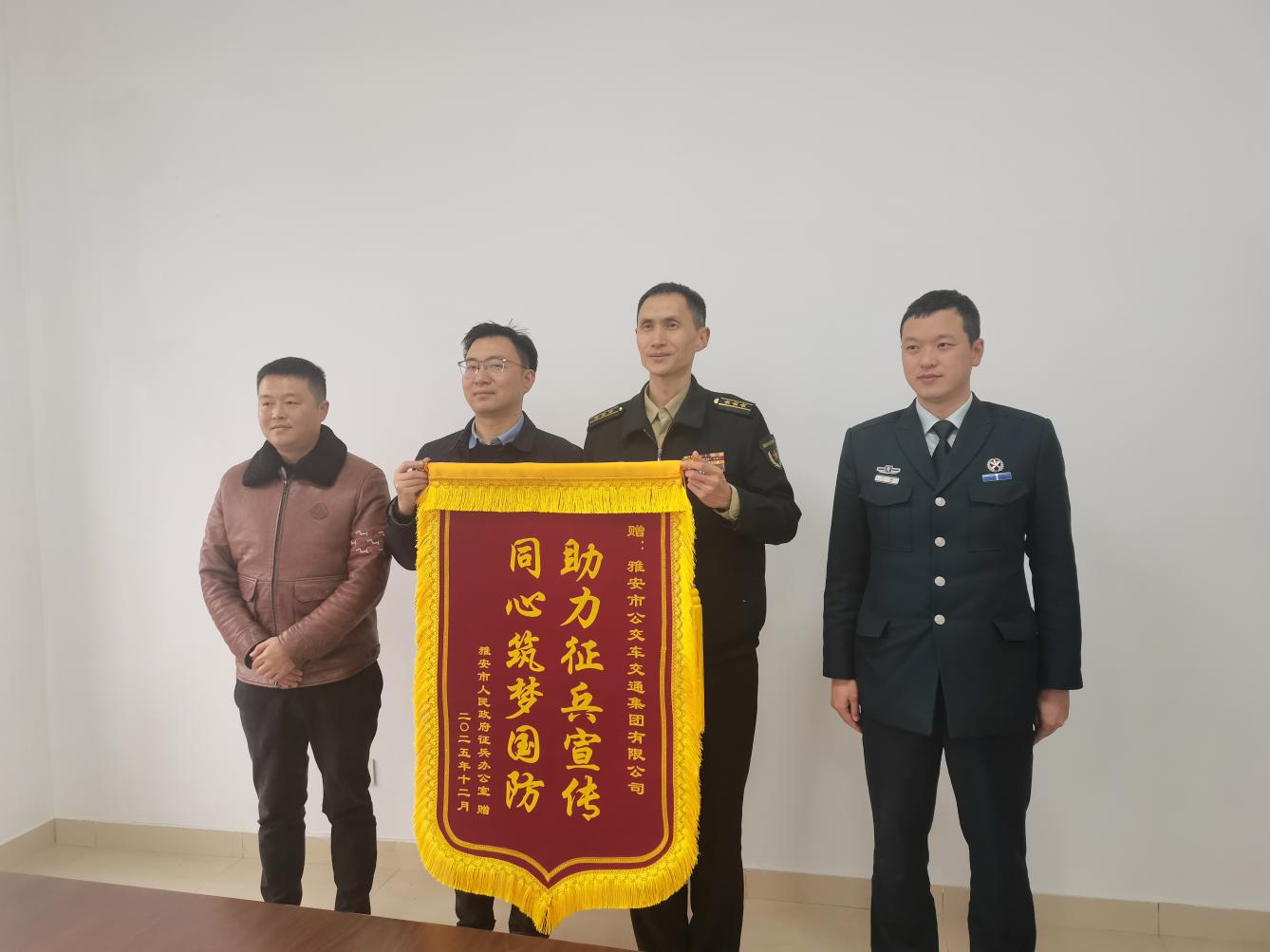 近日,雅安市人民政府征兵辦公室副主任、雅安軍分區(qū)動員處上校處長賈子龍一行專程赴公交集團(tuán)贈送錦旗,感謝公交集團(tuán)在2025年度征兵公益宣傳工作中作出的貢獻(xiàn),公司董事長李強(qiáng)軍接待并開展座談。