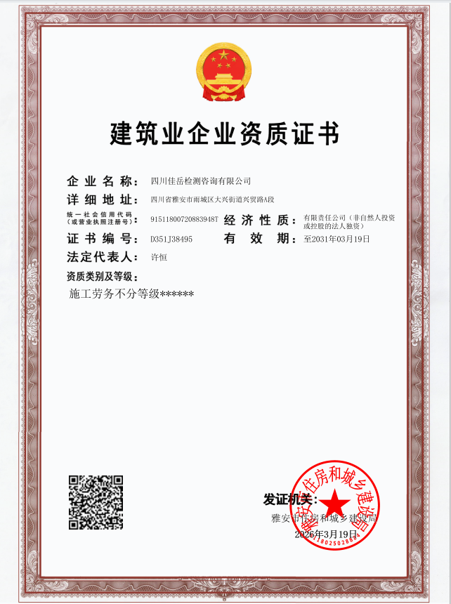 面對建筑檢測服務(wù)市場日趨激烈的競爭態(tài)勢和業(yè)務(wù)結(jié)構(gòu)單一的瓶頸,佳岳公司堅持以提質(zhì)升級為核心,主動破局、向內(nèi)挖潛,將資質(zhì)提升作為增強核心競爭力的關(guān)鍵突破口。3月19日,公司成功取得建筑業(yè)企業(yè)施工勞務(wù)資質(zhì)證書,標志著公司具備承接各類施工勞務(wù)作業(yè)的法定資格,為拓展經(jīng)營領(lǐng)域、完善業(yè)務(wù)鏈條注入新動能。