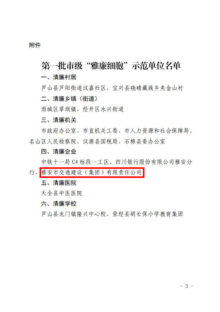 經(jīng)過雅安市黨風廉政建設責任制領(lǐng)導小組辦公室嚴格考評審定,雅安市交通建設(集團)有限責任公司被命名為第一批市級“雅廉細胞”示范單位(清廉企業(yè))。