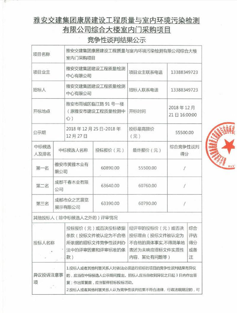綜合大樓室內(nèi)門采購項(xiàng)目競(jìng)爭(zhēng)性談判結(jié)果公示