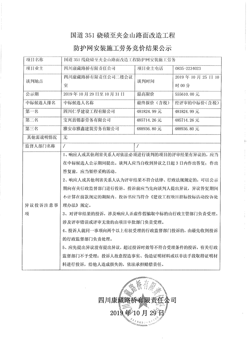 四川康藏路橋有限責(zé)任公司國道351磽磧至夾金山路面改造工程防護(hù)網(wǎng)安裝施工勞務(wù)競(jìng)價(jià)結(jié)果公示