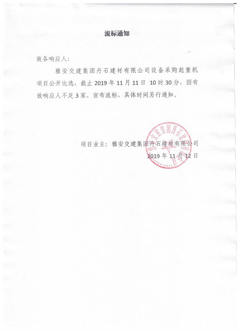 雅安交建集團(tuán)丹石建材有限公司設(shè)備采購起重機(jī)項(xiàng)目流標(biāo)通知