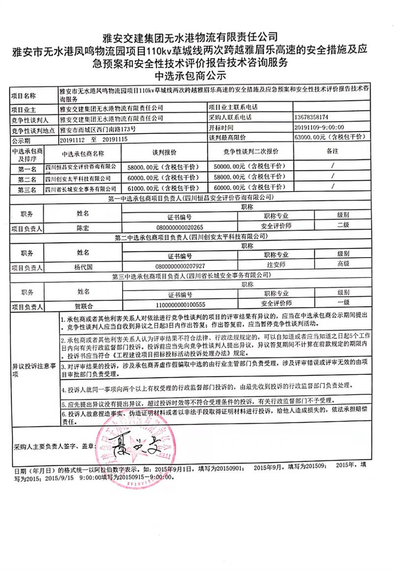 雅安交建集團(tuán)無水港物流有限責(zé)任公司雅安市無水港鳳鳴物流園項目110kv草城線兩次跨越雅眉樂高速的安全措施、應(yīng)急預(yù)案以及安全性技術(shù)評價報告技術(shù)咨詢服務(wù)中選承包商公示