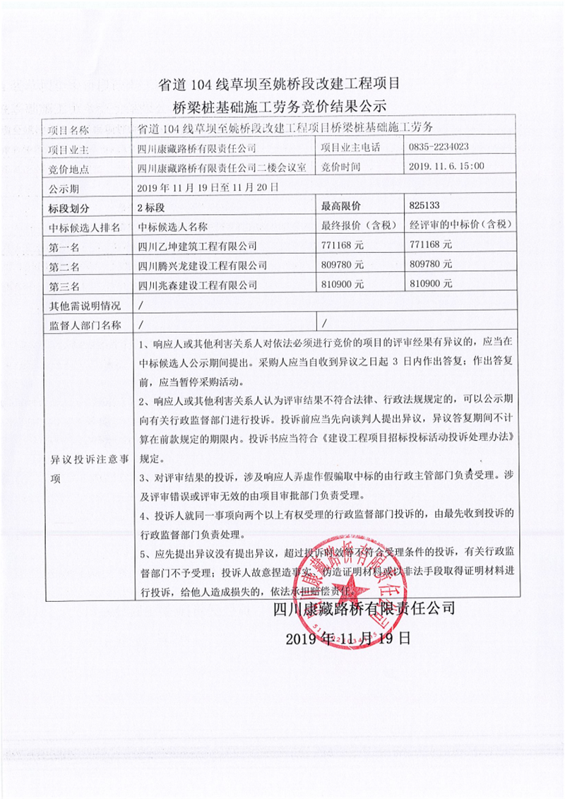 四川康藏路橋有限責任公司省道104線草壩至姚橋段改建工程項目橋梁樁基礎施工勞務競價(2標段)結(jié)果公示