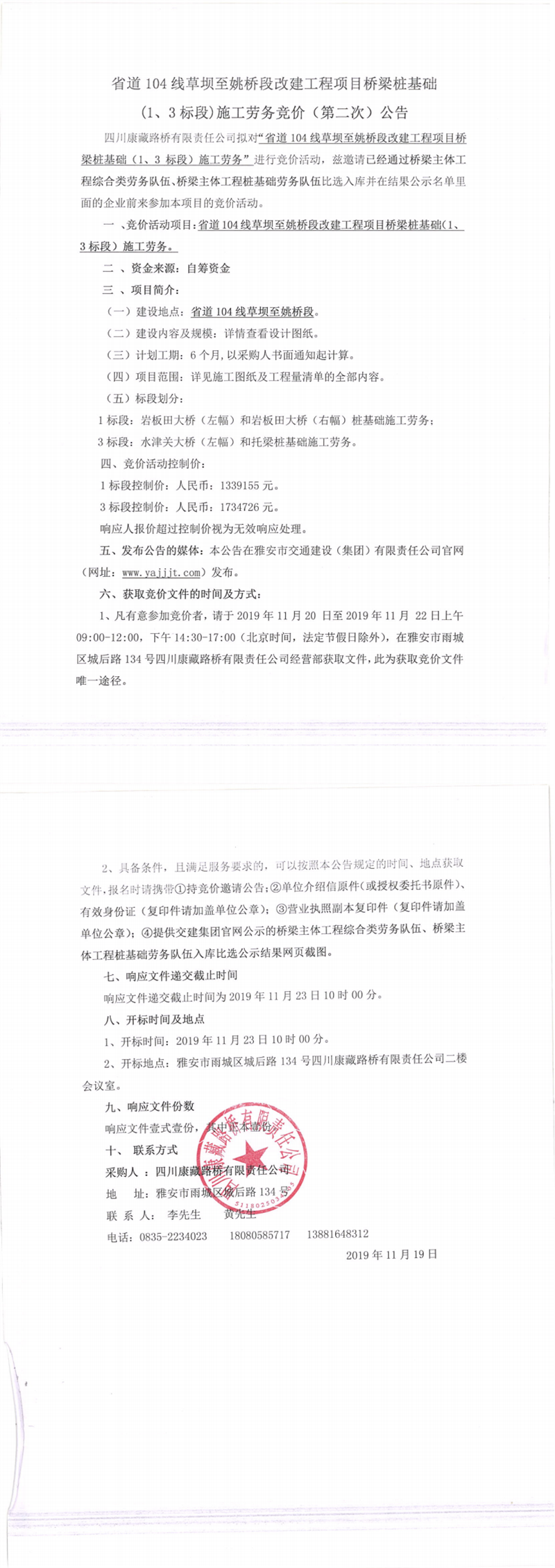 四川康藏路橋有限責(zé)任公司省道104線草壩至姚橋段改建工程項(xiàng)目橋梁樁基礎(chǔ)(1、3標(biāo)段)施工勞務(wù)競(jìng)價(jià)(第二次)公告