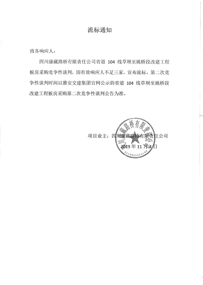 四川康藏路橋有限責(zé)任公司省道104線草壩至姚橋段改建工程板房采購項(xiàng)目流標(biāo)通知