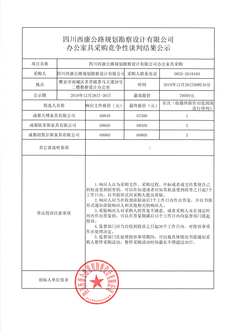 四川西康公路規(guī)劃勘察設計有限公司辦公家具采購競爭性談判結果公示