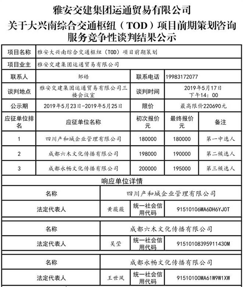 雅安交建集團(tuán)運(yùn)通貿(mào)易有限公司關(guān)于大興南綜合樞紐(TOD)項目前期策劃咨詢服務(wù)競爭性談判結(jié)果公司
