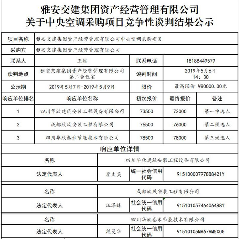 雅安交建集團(tuán)資產(chǎn)經(jīng)營管理有限公司 關(guān)于中央空調(diào)采購項(xiàng)目競爭性談判結(jié)果公示