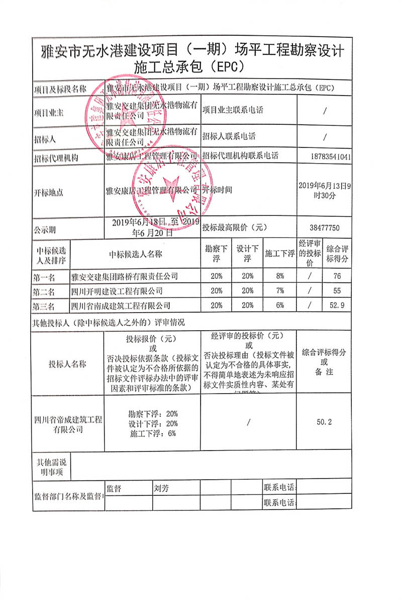 雅安市無(wú)水港建設(shè)項(xiàng)目(一期)場(chǎng)平工程勘察設(shè)計(jì)施工總承包(EPC)公開招標(biāo)結(jié)果公示