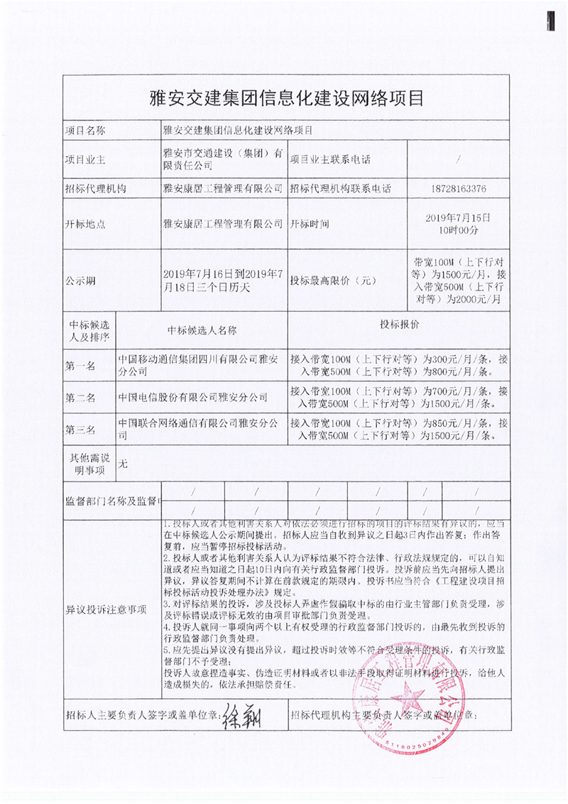 雅安交建集團(tuán)信息化建設(shè)網(wǎng)絡(luò)項目競爭性談判結(jié)果公示