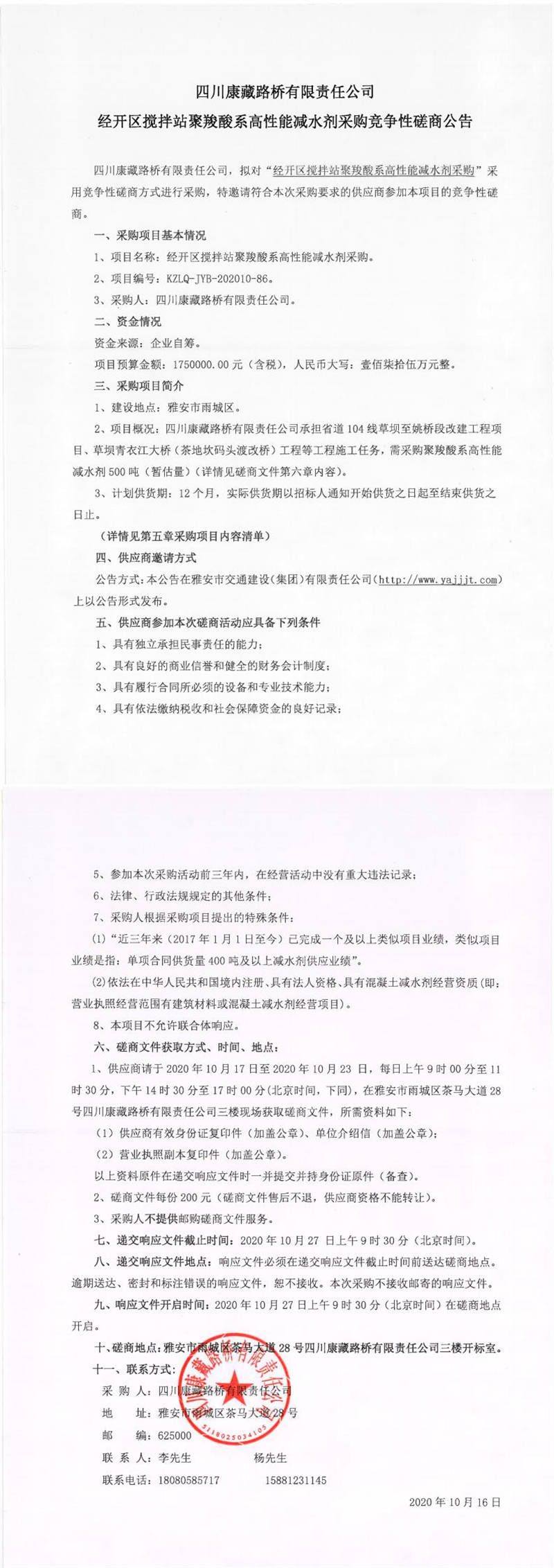 四川康藏路橋有限責(zé)任公司經(jīng)開區(qū)攪拌站聚羧酸系高性能減水劑采購競爭性磋商公告