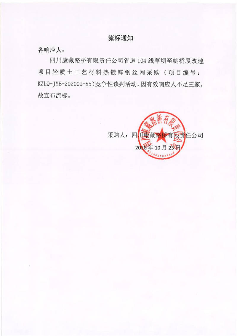四川康藏路橋有限責(zé)任公司省道104線草壩至姚橋段改建項(xiàng)目輕質(zhì)土工藝材料熱鍍鋅鋼絲網(wǎng)采購項(xiàng)目流標(biāo)通知