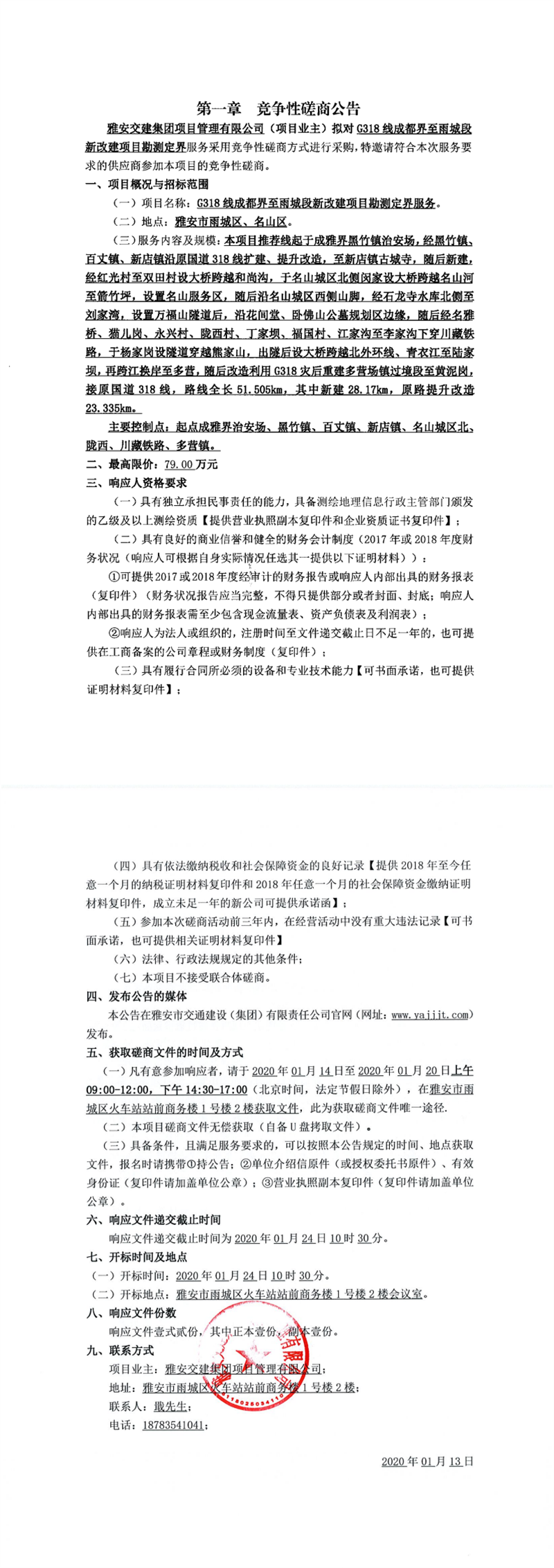 雅安交建集團項目管理有限公司G318線成都界至雨城段新改建項目勘測定界服務競爭性磋商公告