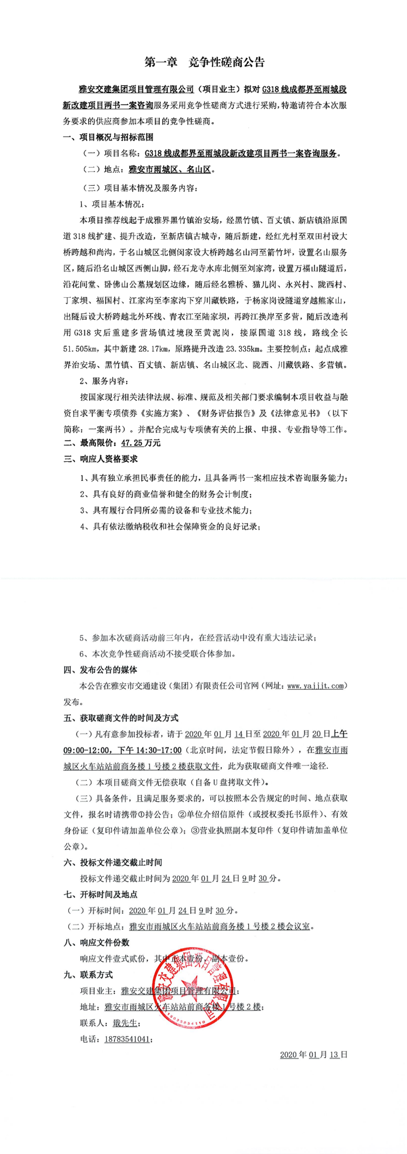 雅安交建集團項目管理有限公司G318線成都界至雨城段新改建項目勘測定界服務(wù)競爭性磋商公告