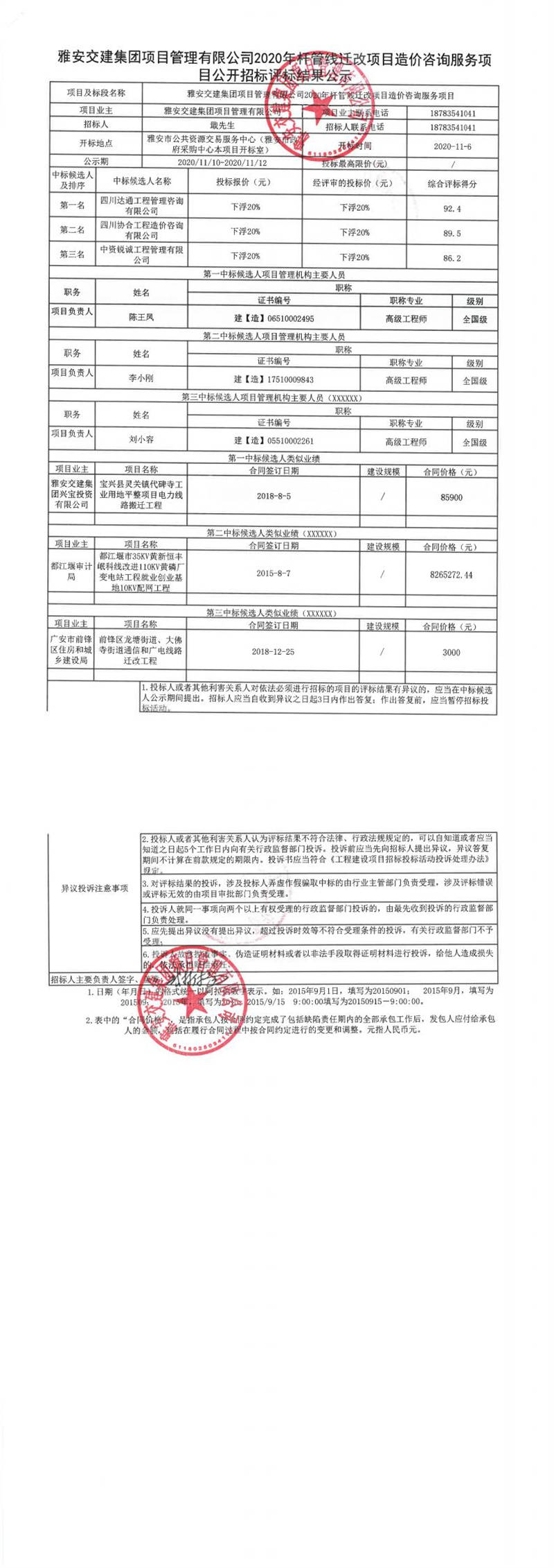 雅安交建集團(tuán)項目管理有限公司2020年桿管線遷改項目造價咨詢服務(wù)項目公開招標(biāo)評標(biāo)結(jié)果公示