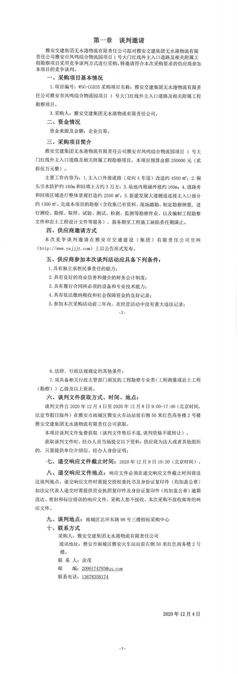 雅安交建集團無水港物流有限責任公司雅安市鳳鳴綜合物流園項目1號大門紅線外主入口道路及相關(guān)附屬工程勘察項目談判公告