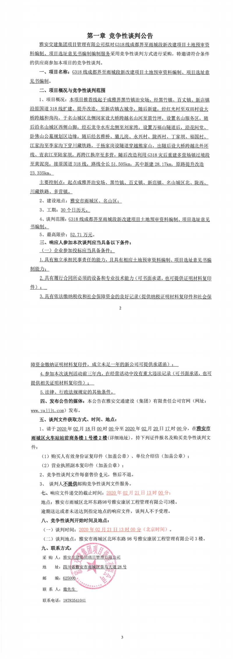 雅安交建集團項目管理有限公司G318線成都界至雨城段新改建項目土地預(yù)審資料編制、項目選址意見書編制競爭性談判公告