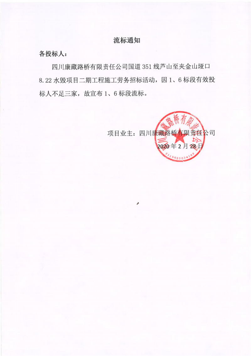四川康藏路橋有限責任公司國道351線蘆山至夾金山埡口8.22水毀項目二期工程施工勞務(wù)(1標段、6標段)流標通知