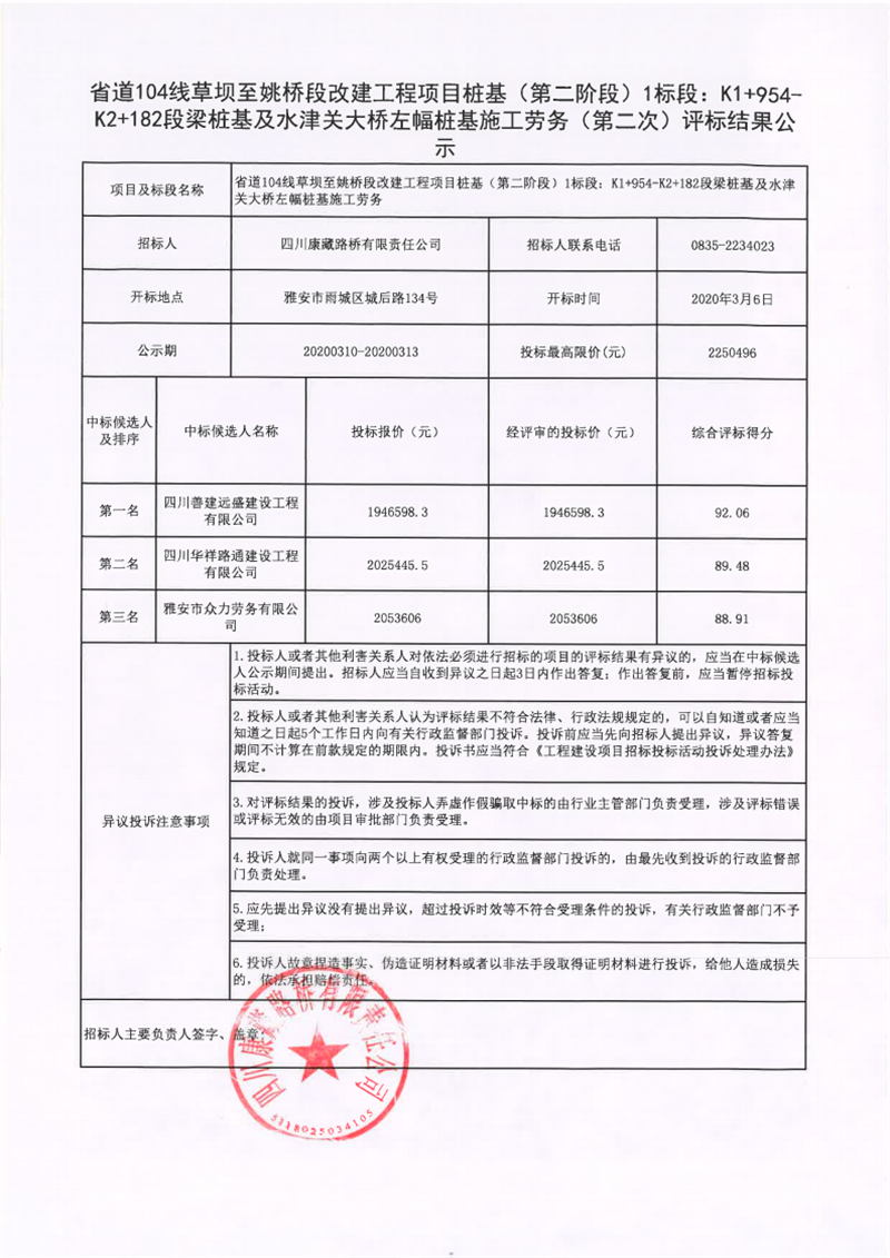四川康藏路橋有限責(zé)任公司省道104線草壩至姚橋段改建工程項目樁基(第二階段)1標段:K1+954-K2+182段梁樁基及水津關(guān)大橋左幅樁基施工勞務(wù)(第二次)評標結(jié)果公示