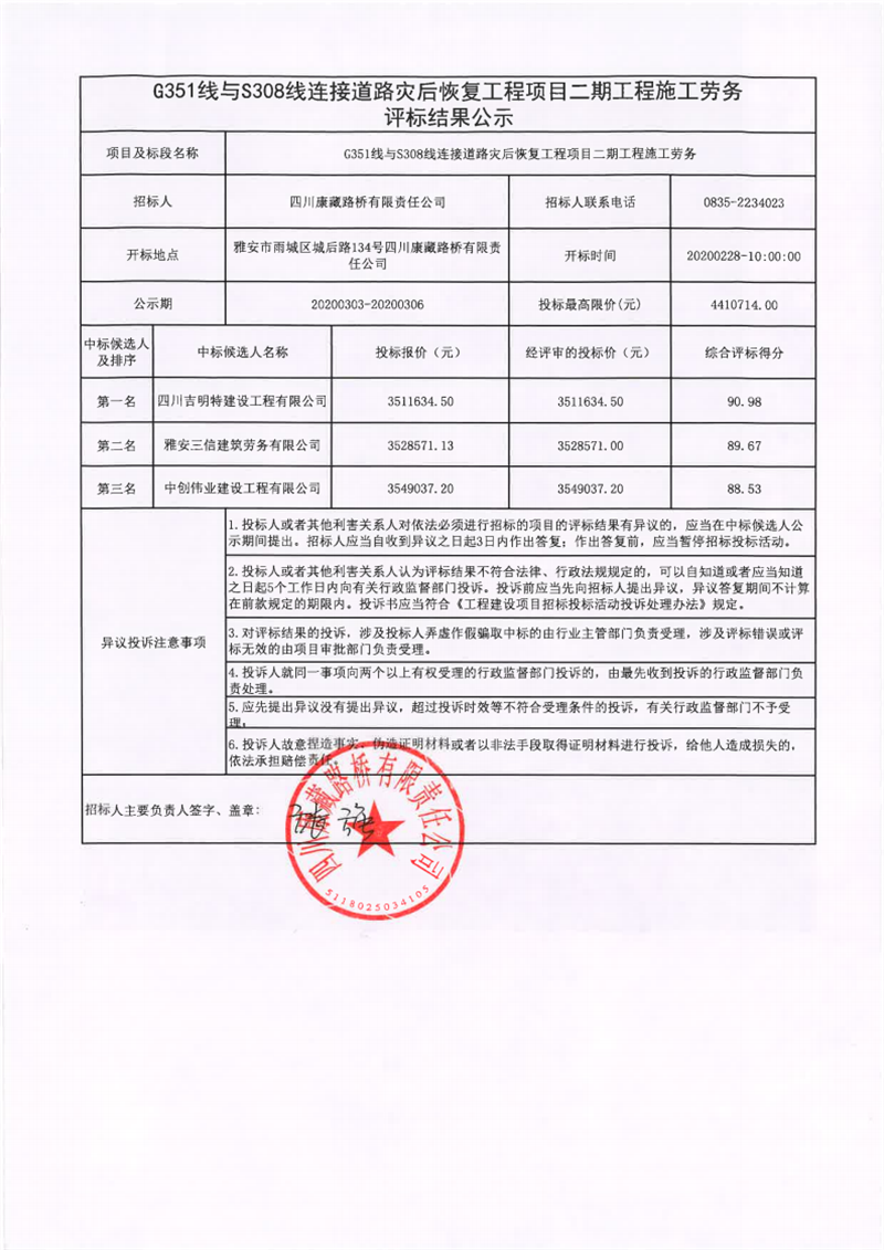 四川康藏路橋有限責(zé)任公司國道351線蘆山至夾金山埡口段8.22水毀項(xiàng)目二期工程施工勞務(wù)五標(biāo)段評(píng)標(biāo)結(jié)果公示