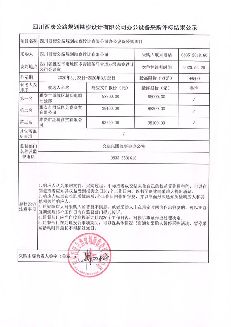 四川西康公路規(guī)劃勘察設(shè)計有限公司辦公設(shè)備采購評標(biāo)結(jié)果公示