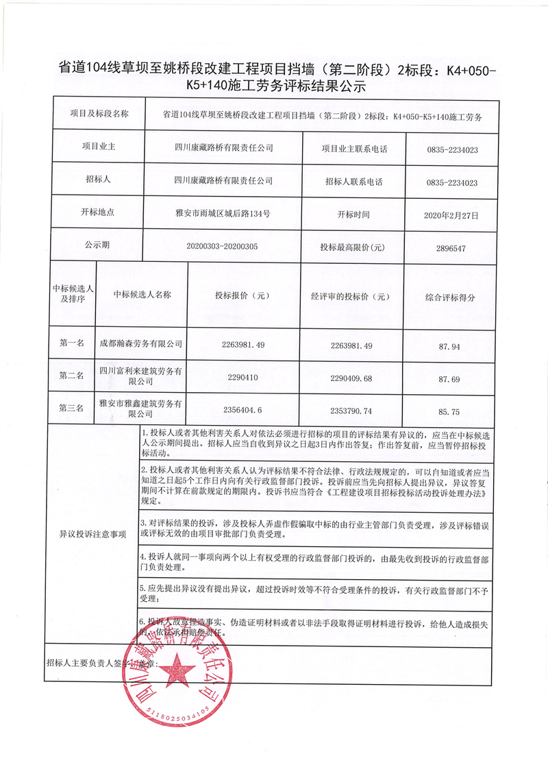 四川康藏路橋有限責任公司省道104線草壩至姚橋段改建工程項目擋墻(第二階段)2標段:K4+050-K5+140施工勞務評標結果公示