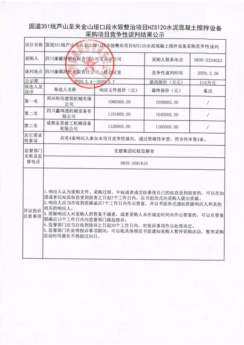四川康藏路橋有限責(zé)任公司國(guó)道351線(xiàn)蘆山至夾金山埡口段水毀整治項(xiàng)目在建工程項(xiàng)目HZS120水泥混凝土攪拌設(shè)備采購(gòu)項(xiàng)目競(jìng)爭(zhēng)性談判結(jié)果公示