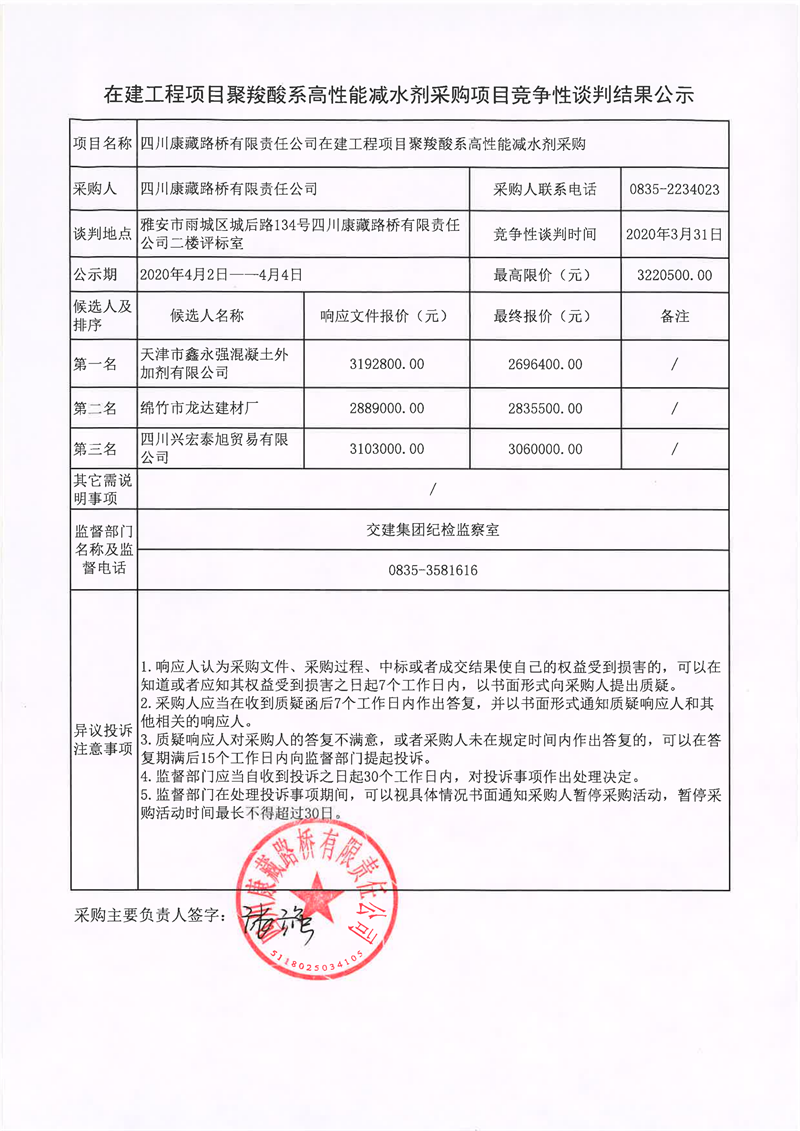 四川康藏路橋有限責(zé)任公司在建工程項(xiàng)目聚羧酸系高性能減水劑采購(gòu)項(xiàng)目競(jìng)爭(zhēng)性談判結(jié)果公示