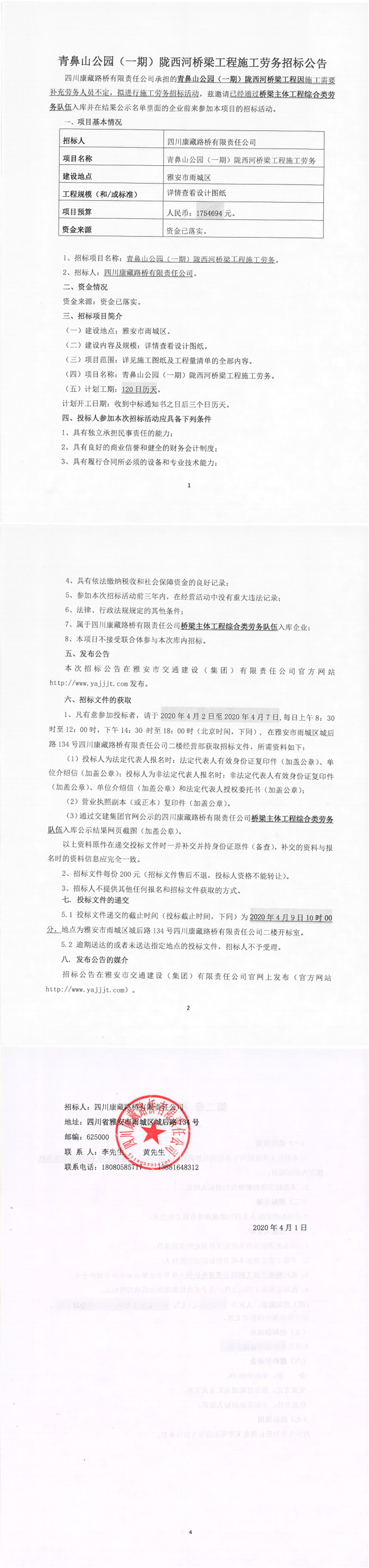 四川康藏路橋有限責任公司青鼻山公園(一期)隴西河橋梁工程施工勞務招標公告