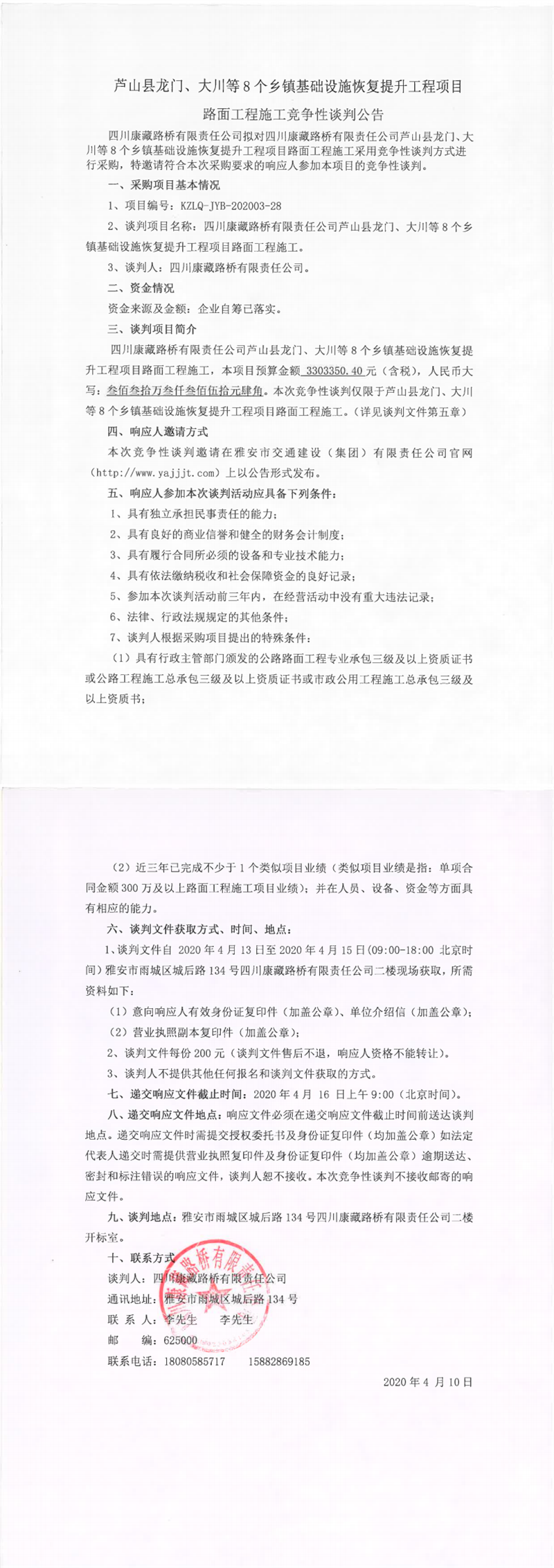 四川康藏路橋有限責任公司蘆山縣龍門、大川等8個鄉(xiāng)鎮(zhèn)基礎(chǔ)設(shè)施恢復(fù)提升工程項目路面工程施工競爭性談判公告