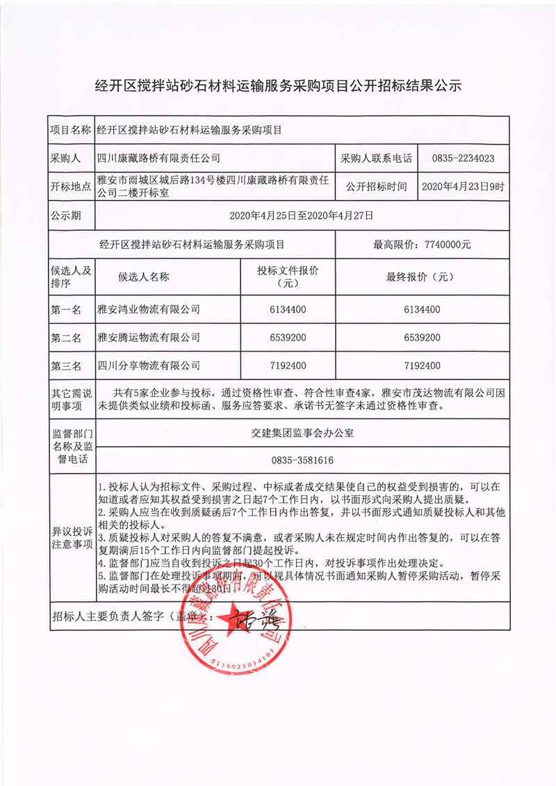 四川康藏路橋有限責任公司經(jīng)開區(qū)攪拌站砂石材料運輸服務采購項目公開招標結(jié)果公示