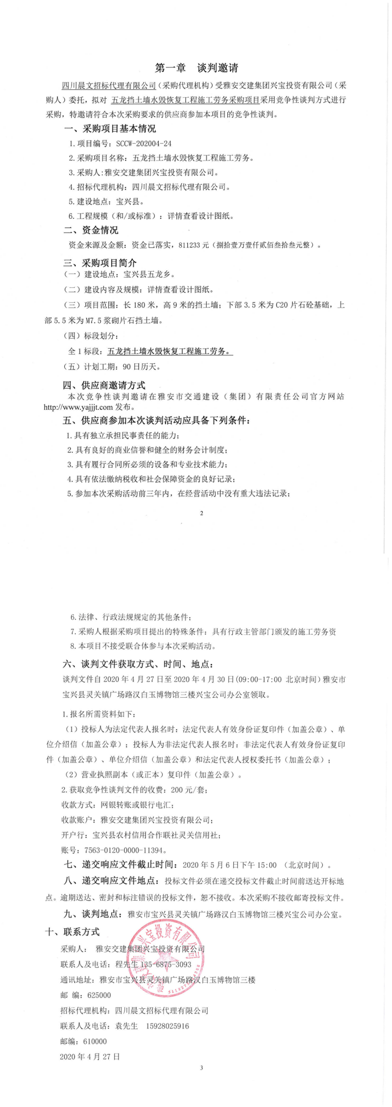 雅安交建集團(tuán)興寶投資有限公司五龍擋土墻水毀恢復(fù)工程施工勞務(wù)采購項(xiàng)目競爭性談判公告
