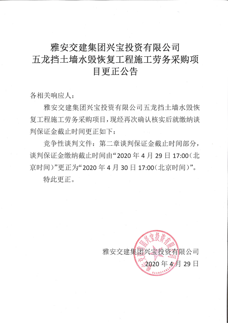 雅安交建集團(tuán)興寶投資有限公司五龍擋土墻水毀恢復(fù)工程施工勞務(wù)采購項目更正公告