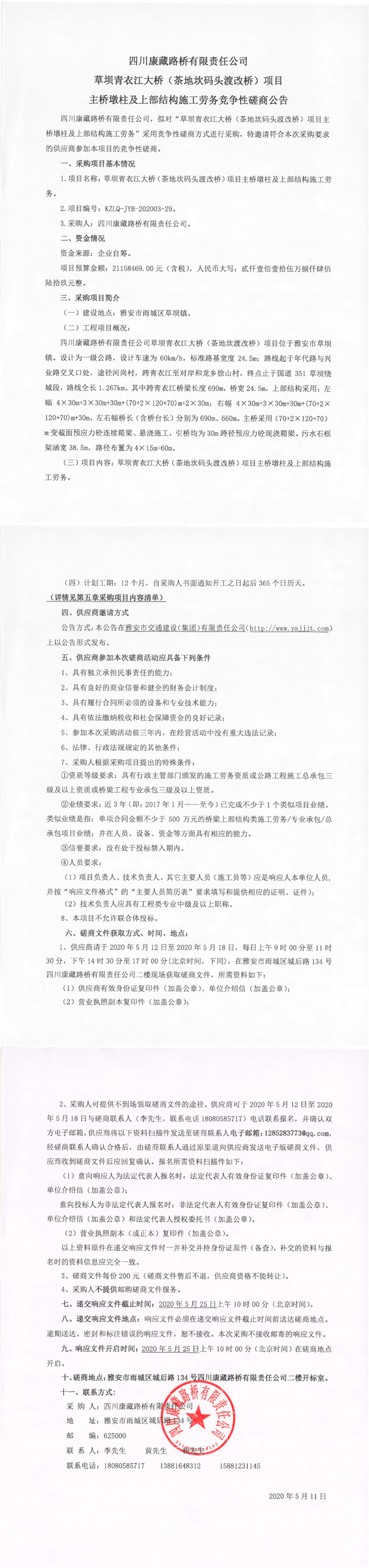 四川康藏路橋有限責任公司草壩青衣江大橋(茶地坎碼頭渡改橋)項目主橋墩柱及上部結(jié)構(gòu)施工勞務(wù)競爭性磋商公告