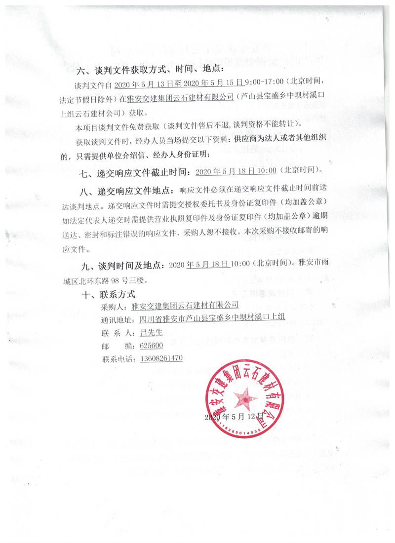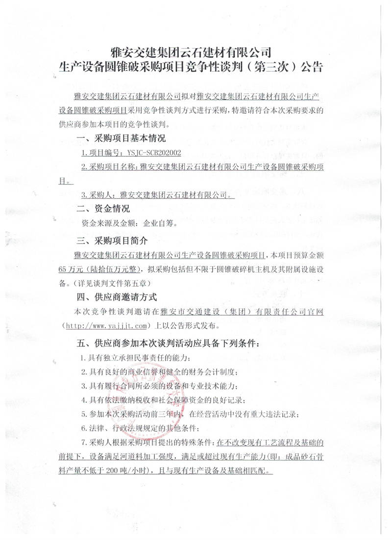 雅安交建集團(tuán)云石建材有限公司生產(chǎn)設(shè)備圓錐破采購(gòu)項(xiàng)目競(jìng)爭(zhēng)性談判(第三次)公告