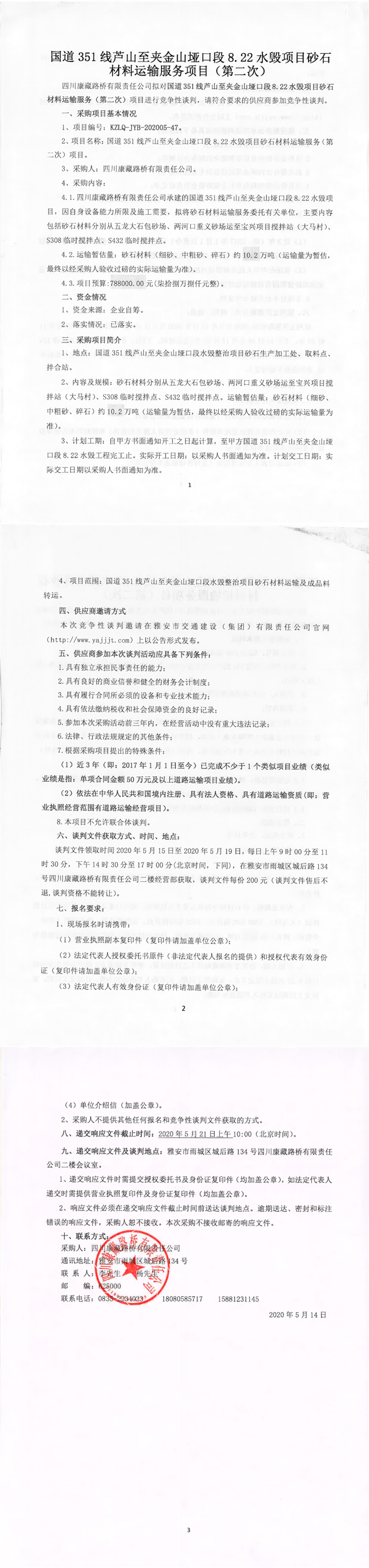 四川康藏路橋有限責(zé)任公司國道351線蘆山至夾金山埡口段8.22水毀項(xiàng)目砂石材料運(yùn)輸服務(wù)項(xiàng)目(第二次)競(jìng)爭(zhēng)性談判公告