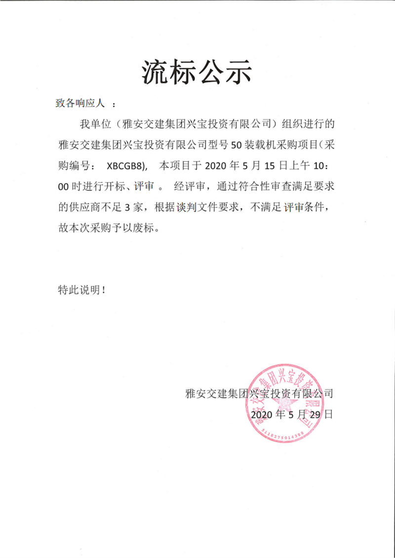 雅安交建集團(tuán)興寶投資有限公司型號50裝載機(jī)采購項目流標(biāo)公示