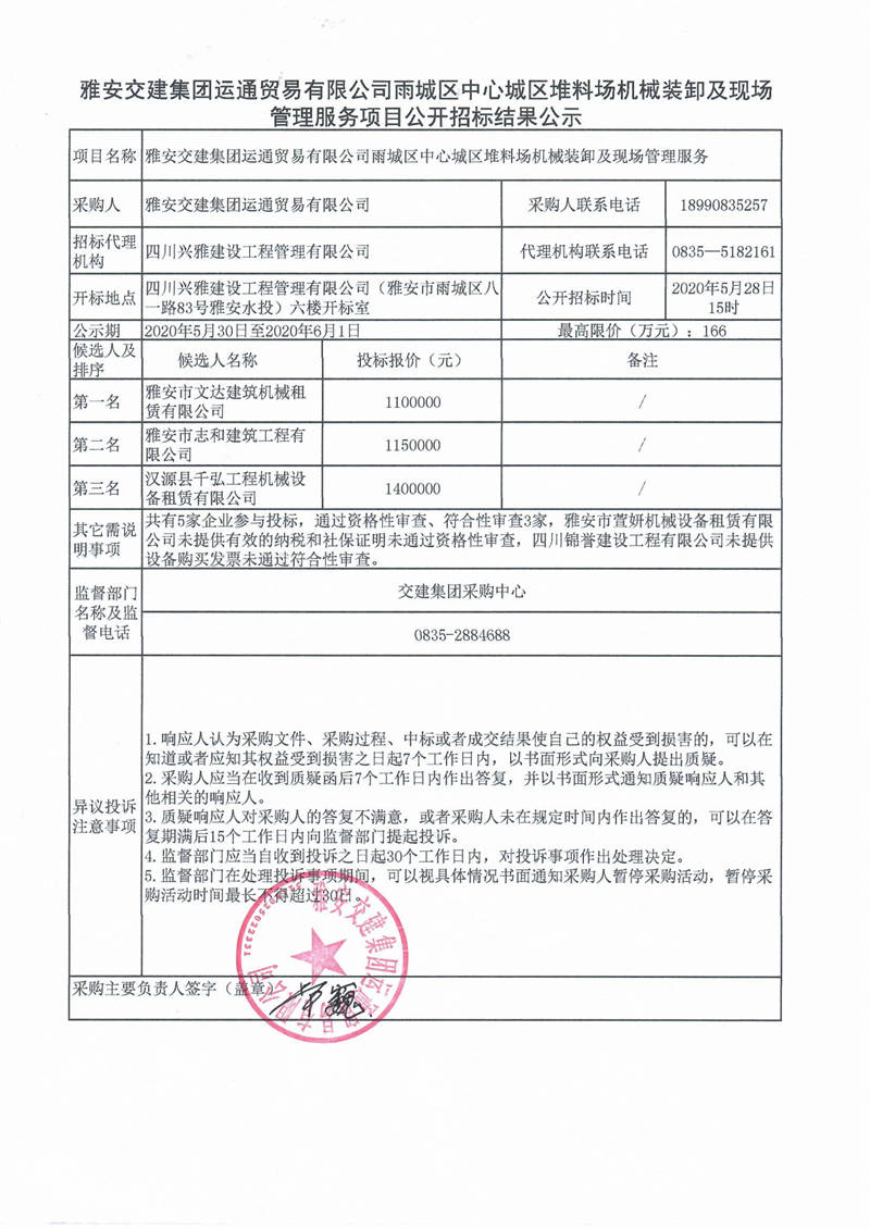雅安交建集團(tuán)運(yùn)通貿(mào)易有限公司雨城區(qū)中心城區(qū)堆料場機(jī)械裝卸及現(xiàn)場管理服務(wù)項(xiàng)目公開招標(biāo)結(jié)果公示