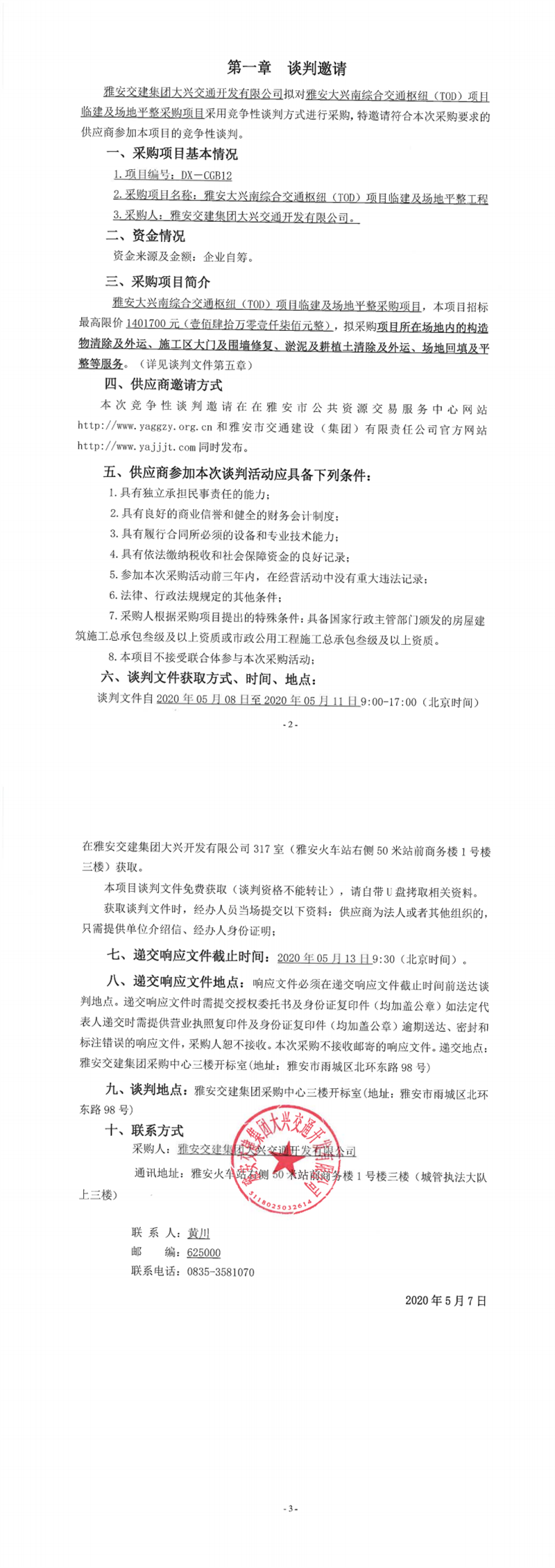 雅安交建集團(tuán)大興交通開發(fā)有限公司雅安大興南綜合交通樞紐(TOD)項(xiàng)目臨建及場地平整工程競爭性談判公告