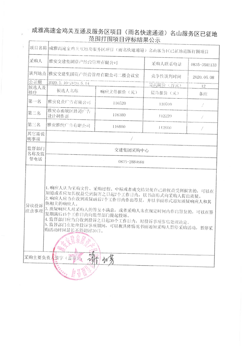 雅安交建集團(tuán)資產(chǎn)經(jīng)營管理有限公司成雅高速金雞關(guān)互通及服務(wù)區(qū)項(xiàng)目(雨名快速通道)名山服務(wù)區(qū)已征地范圍打圍項(xiàng)目評標(biāo)結(jié)果公示