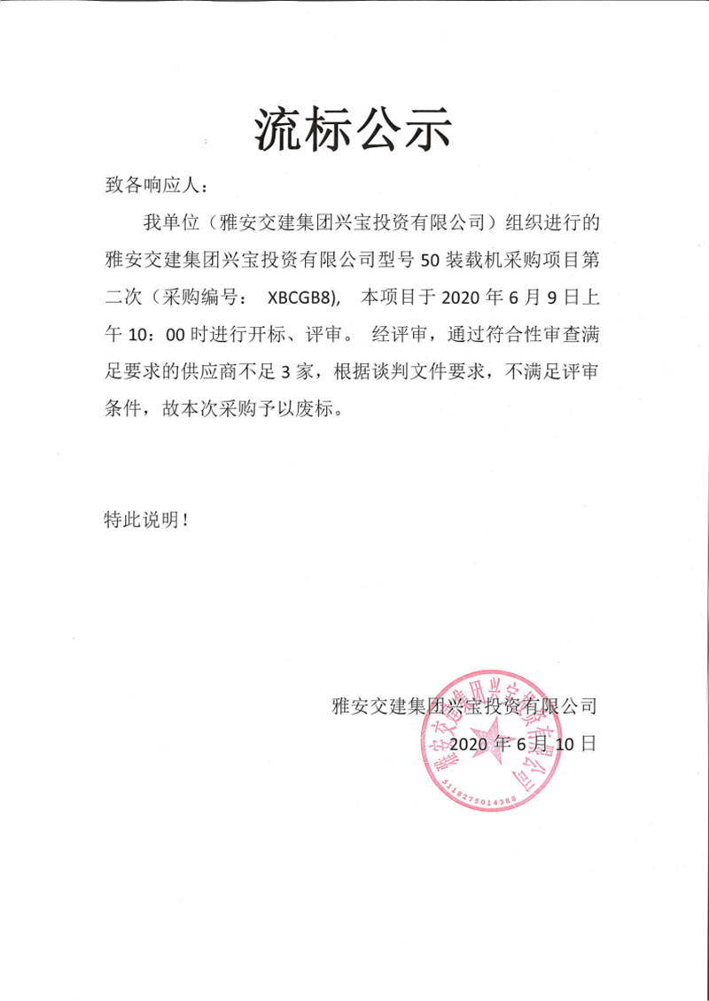 雅安交建集團(tuán)興寶投資有限公司型號(hào)50裝載機(jī)采購項(xiàng)目第二次流標(biāo)公示