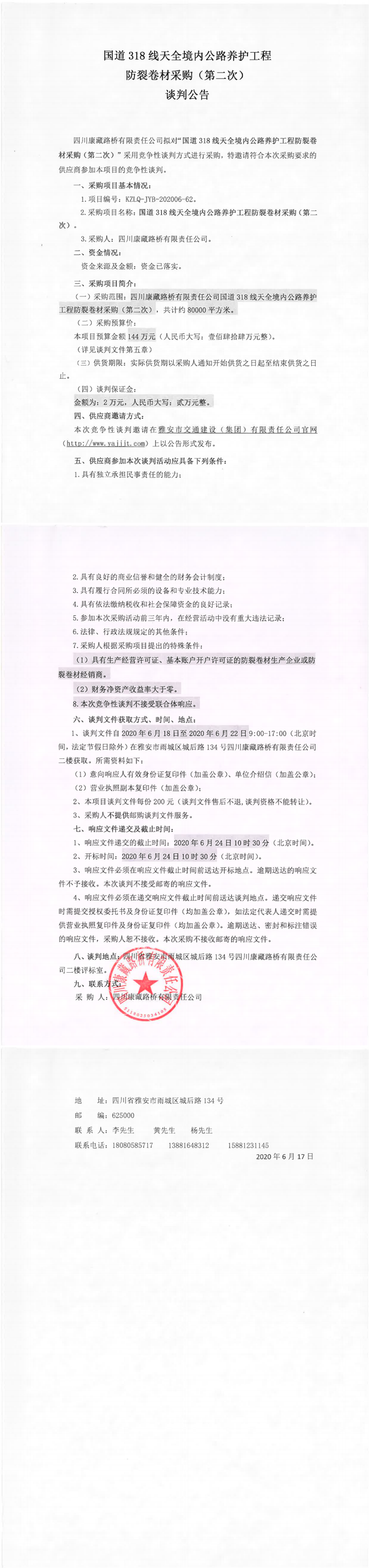 四川康藏路橋有限責任公司國道318線天全境內(nèi)公路養(yǎng)護工程防裂卷材采購(第二次)談判公告