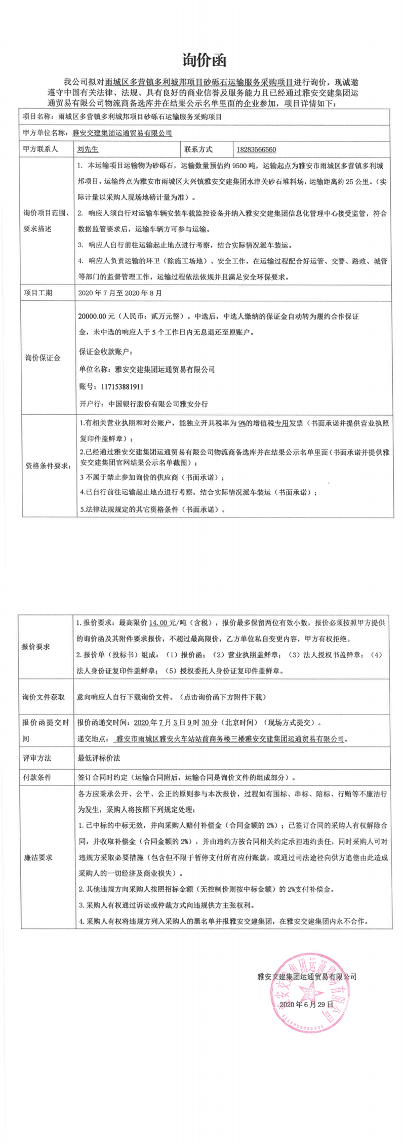 雅安交建集團運通貿(mào)易有限公司雨城區(qū)多營鎮(zhèn)多利城邦項目砂礫石運輸服務(wù)采購項目詢價函