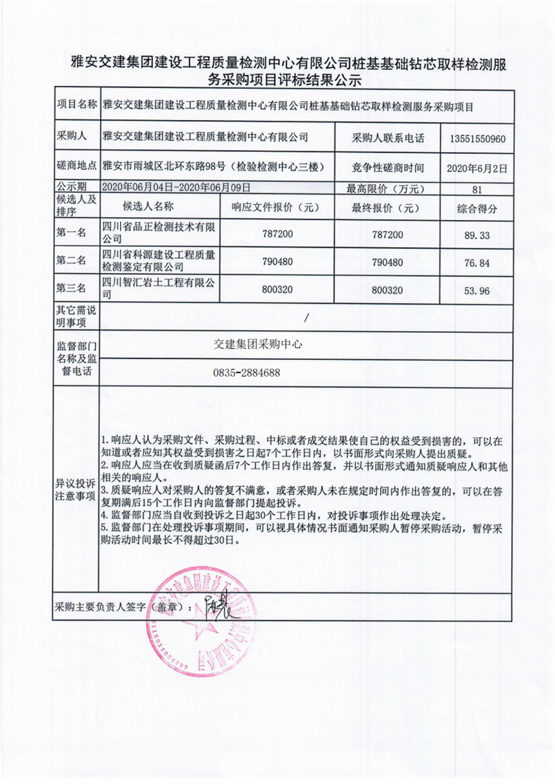 雅安交建集團(tuán)建設(shè)工程質(zhì)量檢測中心有限公司樁基基礎(chǔ)鉆芯取樣檢測服務(wù)采購項(xiàng)目評標(biāo)結(jié)果公示