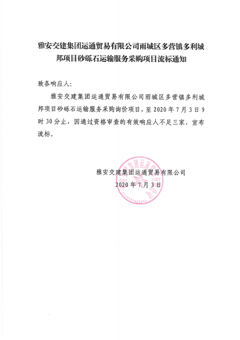 雅安交建集團運通貿易有限公司雨城區(qū)多營鎮(zhèn)多利城邦項目砂礫石運輸服務采購項目流標通知